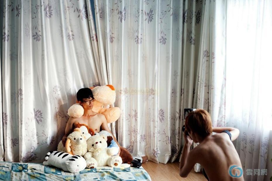 Phat (21岁,摄影师) 在卧室里帮他的男朋友Minh (21岁,学生)和毛绒玩具拍照,以庆祝两人在一起1周年。