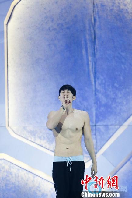 2013年4月10日,北京,近日,江苏卫视《星跳水立方》录制现场。吴建豪赤膊上阵大秀健硕腹肌惹来阵阵尖叫。