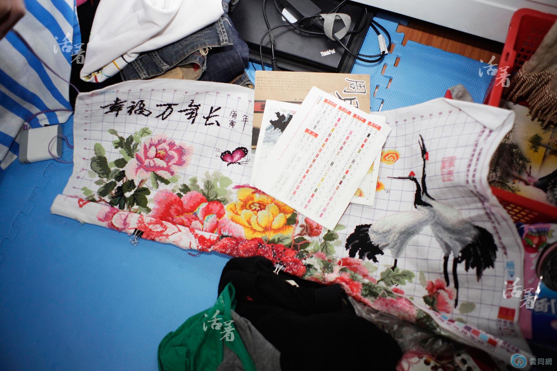 蜜桃正在绣一副十字绣,“幸福万年长”。蜜桃说他有个理想,如果哪天他有钱了,他就开个刺绣厂,把他的“姐妹们”都接来,一起工作,一起养老。