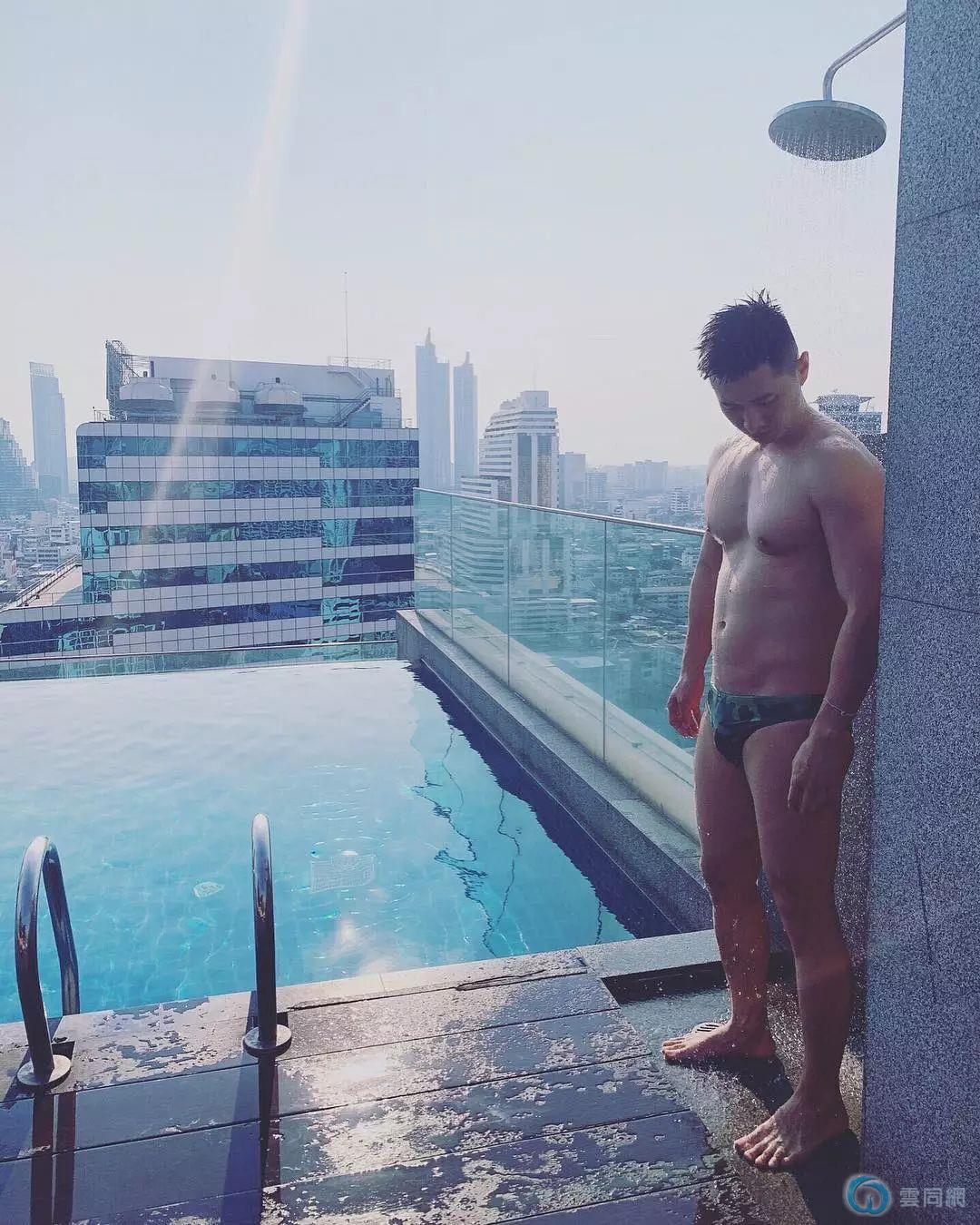 泳池里那位穿花泳裤的肌肉大叔,泳裤真的太小了!