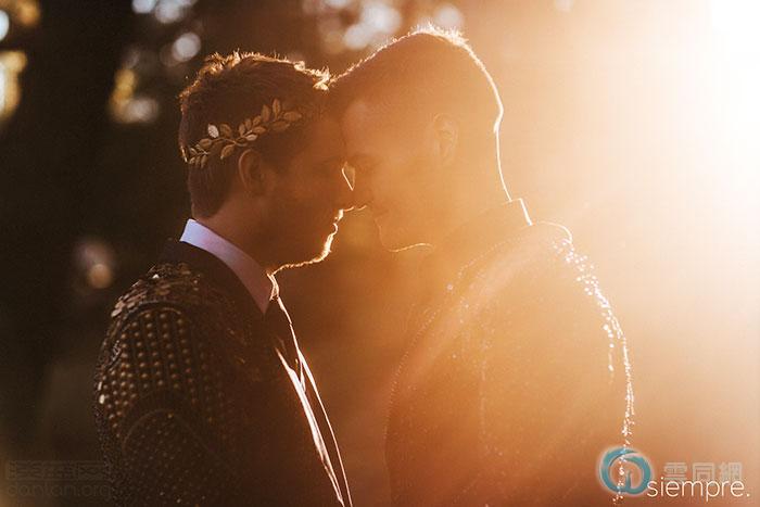 10月15日,澳大利亚著名婚纱设计师乔治·艾西萨(George Elsissa)和米切尔·唐顿(Mitchell Taunton)举行奢华婚礼,其中米切尔头戴黄金叶状头冠,身穿黄金叶点缀的同款罗马风格外套,格外引人注目。