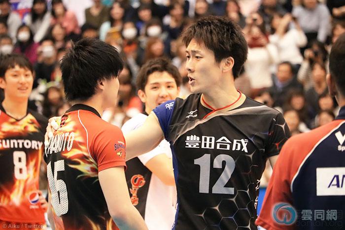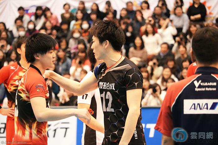 日本男子排球全明星赛上,球员山本涌(左)得分后向对方球员高松卓矢做出挑衅动作,引起一场争执。