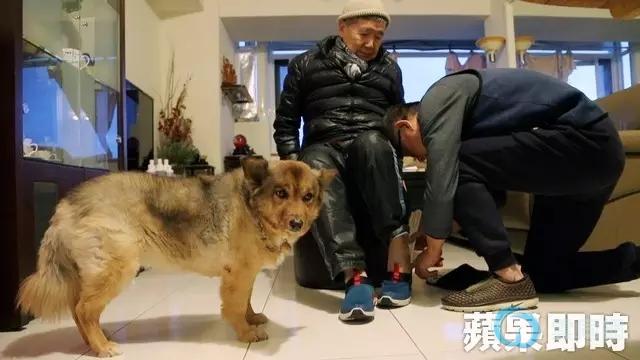 74岁的何祥(左)行动不方便,外出前,罹患小中风的56岁伴侣王天明(右)体贴的帮忙穿鞋。