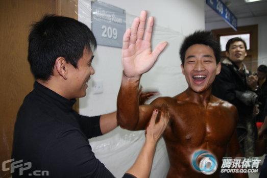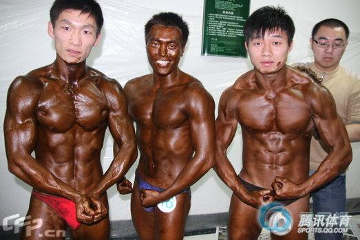 2008年12月6日,第六届北京市大学生健美比赛在地质大学举行,北京市21所大学参加,清华取得团体第一,北京体育大学团体第二,现场引众多女粉丝尖叫。图为:北京市大学生健美比赛前擦油热身。