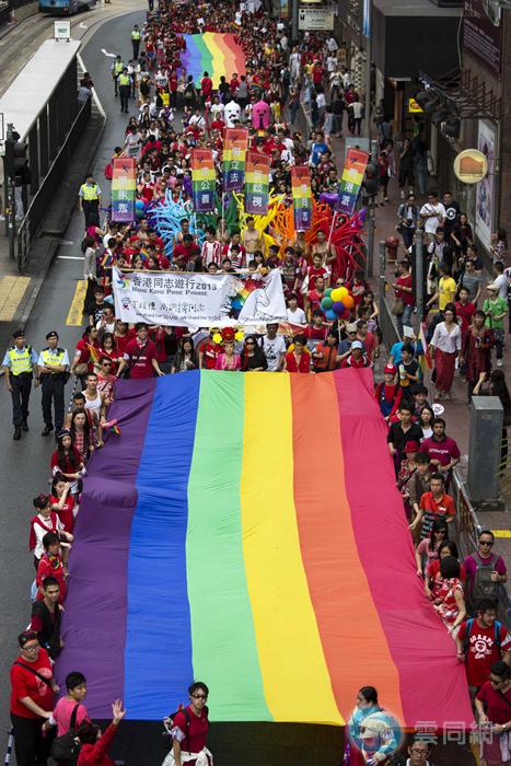 11月9日下午,来自两岸三地以及海外的平等权利支持者举行主题为“爱不歧视,高调撑同志”的2013年香港同志大游行,争取立法反性倾向歧视