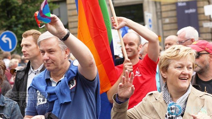 活动主办方表示,周六约有10余万人和30辆华丽彩车参加了这项年度盛会,柏林市长沃维莱特(Klaus Wowereit)、德国联邦家庭事务部长施维西格(Manuela Schwesig)等官员均走在队伍最前方。