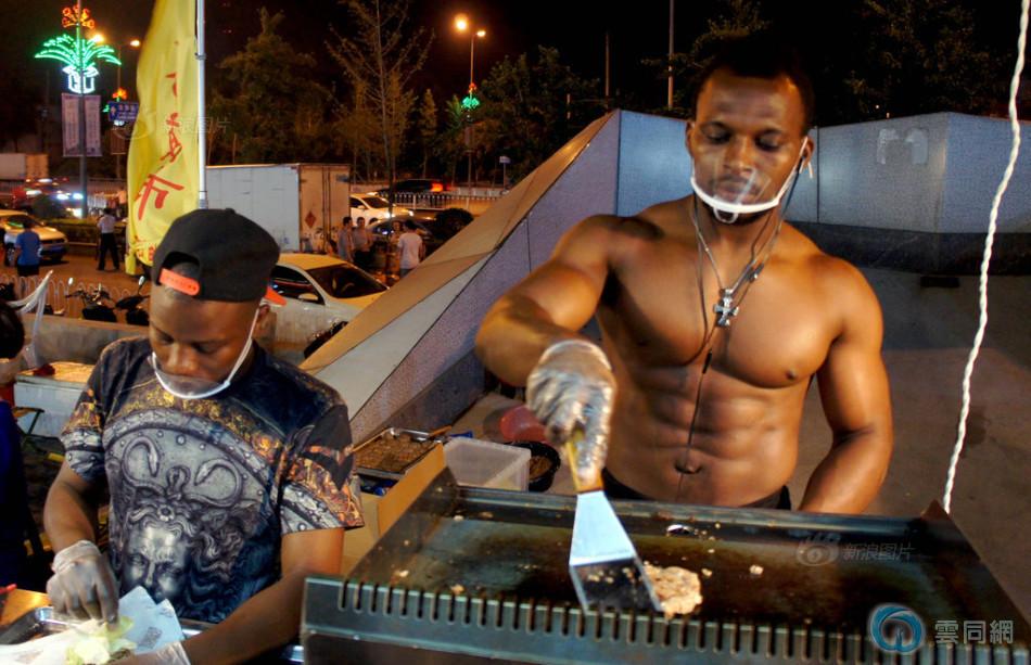 07月29日,在沈阳一夜市上,两个来自非洲的“小二黑”创办的小黑汉堡吸引大量市民前来。名叫约翰的非洲小伙一边做着汉堡,一边秀着自己跳动的肌肉,让前来的市民尖叫。