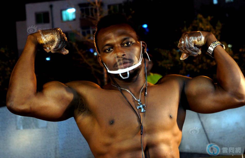 名叫约翰的非洲小伙一边做着汉堡,一边秀着自己跳动的肌肉,让前来的市民尖叫