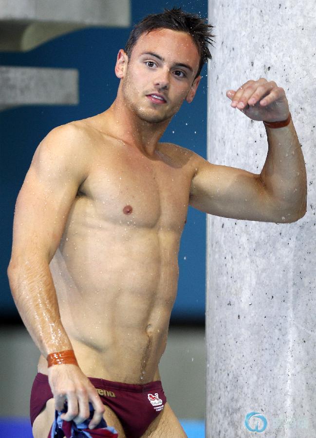 2014年8月3日 爱丁堡——汤姆·戴利成功卫冕英联邦运动会男子十米跳台冠军 8月2日,英格兰选手汤姆·戴利的母亲黛比(左一)、第81届奥斯卡最佳原创剧本奖得主达斯汀·兰斯·布莱克(左二)、好友索菲·李(右一)与约瑟夫·坎茨在看台上为其祝贺。当日,在爱丁堡举行的第20届英联邦运动会跳水男子十米跳台决赛中,该项目2009年世锦赛冠军、2012年伦敦奥运会铜牌得主、卫冕冠军、英格兰选手汤姆·戴利以516.55分的总成绩,获得冠军。