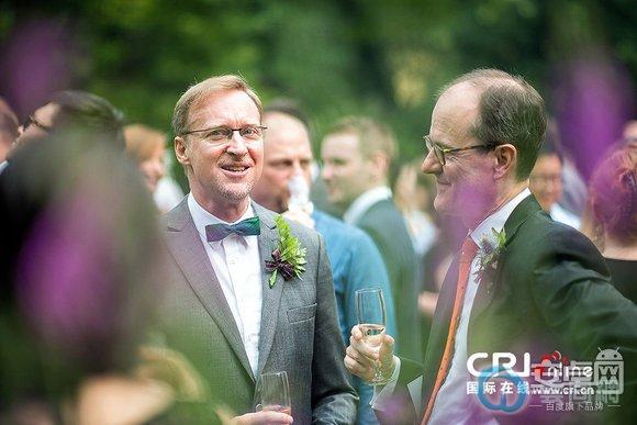 18 英国大使吴思田举起香槟恭祝Brian。在至亲好友的见证下,Scott和Brian拿到了带有钢印的结婚证,Brian在微博中说“Love is GREAT”。让我们相信,爱是可以没有界限的,他们举起杯中的香槟为此庆祝,至爱无上!