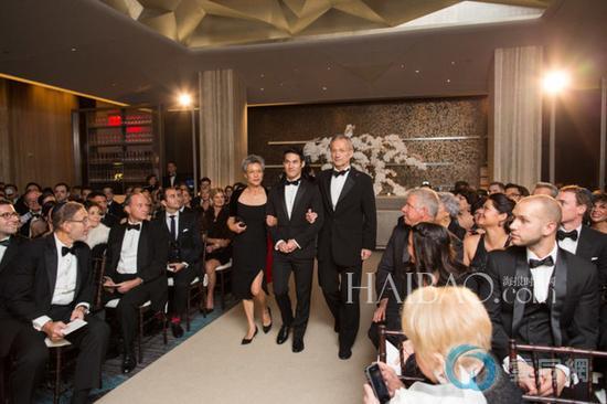 Joseph Altuzarra在父母的陪伴下走进礼堂,妈妈的裙子也来自他的设计。