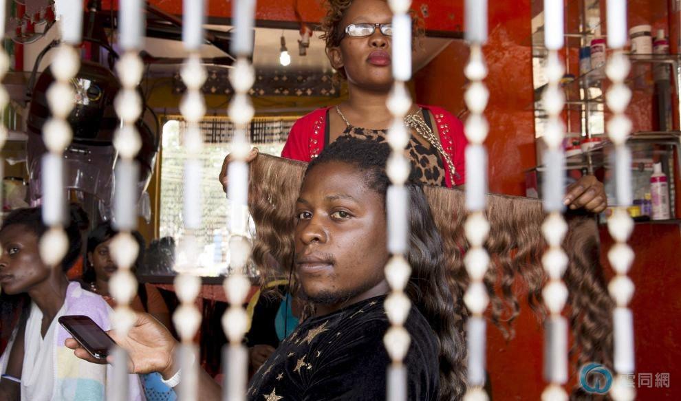 参加选美比赛前,“BadBlack”在一家美发店里做头发。