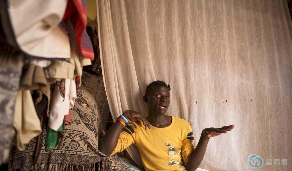 坎帕拉郊区的一个秘密社区,变性人Rihana坐在自己的床上。