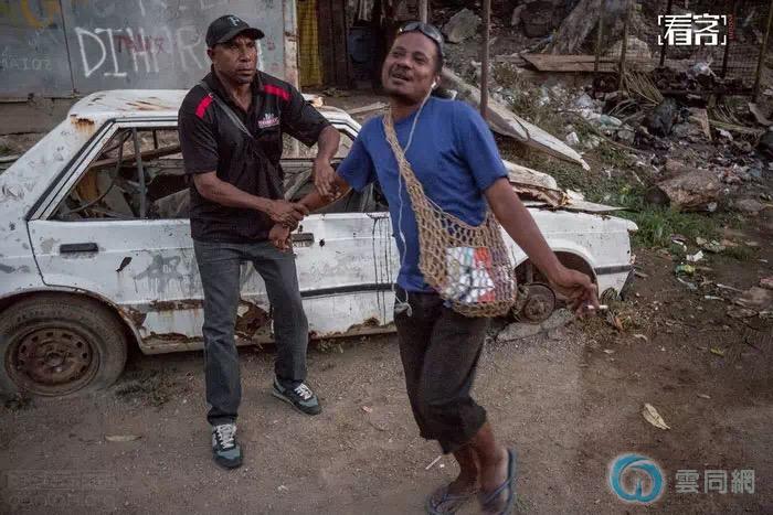 一位本地村民抓着斯皮迪的手。村里仍有村民当街取笑性少数群体——斯皮迪说他能容忍他们,他们表面取笑同性恋,背地里却有人靠近同性恋者,寻求性关系。