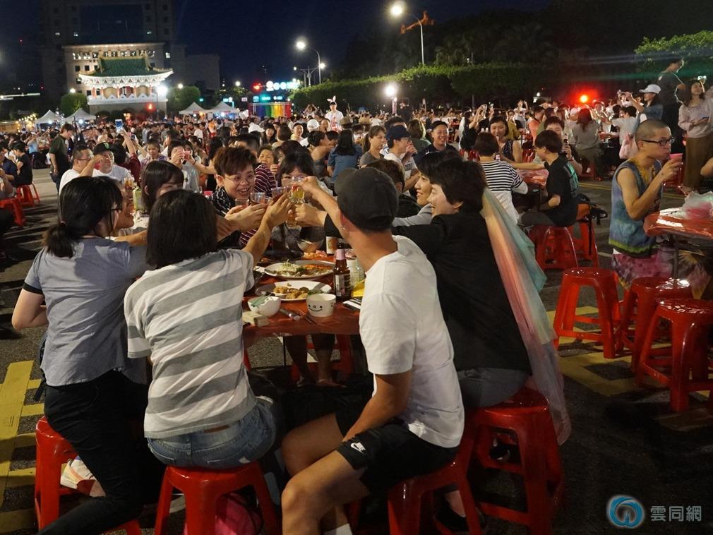 晚宴于19时正式开始,160桌的伴侣、贵宾、民众等,在主持人的倒数下一齐敬酒,参与历史性的一刻,这也是亚洲史上第一次具有法律意义的传统“办桌”同婚宴。