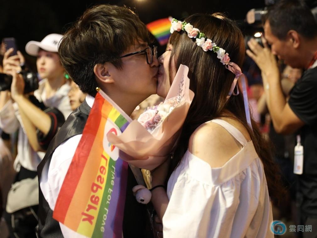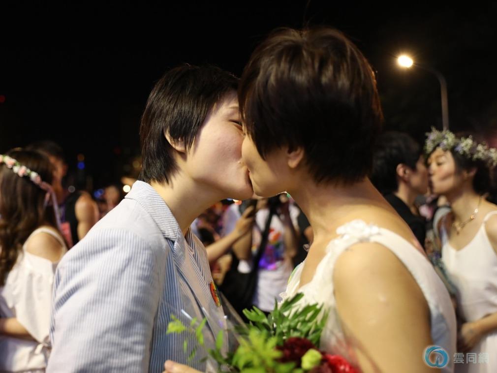 总共有20对伴侣在舞台上集体参加证婚仪式,男女青壮皆有,其中有10对已于24日完成结婚登记,不过在台湾先办婚礼再行登记也是常见的流程。图为现代婚礼的最高潮:伴侣献吻。