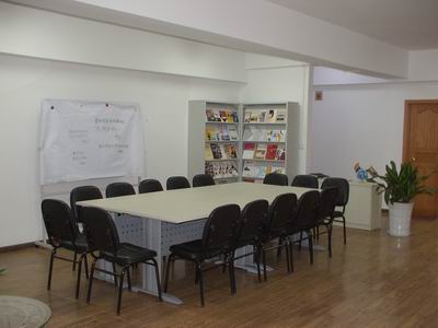 两个书架中间是留言板。宁谧的白色,守候着每一位朋友,积累着社区的发展的点滴。屋子中间是四张会议桌,为了营造三位老师与大家面对面平和地交流,桌子摆成一排,上面有两束开放的玫瑰花,整个房间鲜活起来。一束插在一个紫色陶瓷制的花瓶里,花瓶是恐龙从家里拿来“支边”的。另外一束插在一个外围包着花色纸的小圆筒里,“物尽其用”,这个小筒原来是奶粉筒。聪明的人。