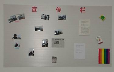 正对着门口的一面墙上开辟为社区的宣传栏。上面贴着3月底内部成员见面活动的照片,4月12号晚上李银河座客社区剪影,当地一家媒体对这次活动的报道被剪贴在上面。右下脚是一张印刷着六色旗的纸,原来是工作人员将“爱白”的资料的一面贴在上面。