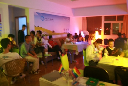 前台的赛歌火爆热烈,后台领取安全套、润滑剂的活动也在悄然进行。有的朋友可能不好意思,歌唱到高潮,观众情绪激昂时,便也正是中心的工作人员恐龙“趁机”忙着给大家拿安全套润滑剂时。寓健康于娱乐,似乎是此情此景最贴切的主角。