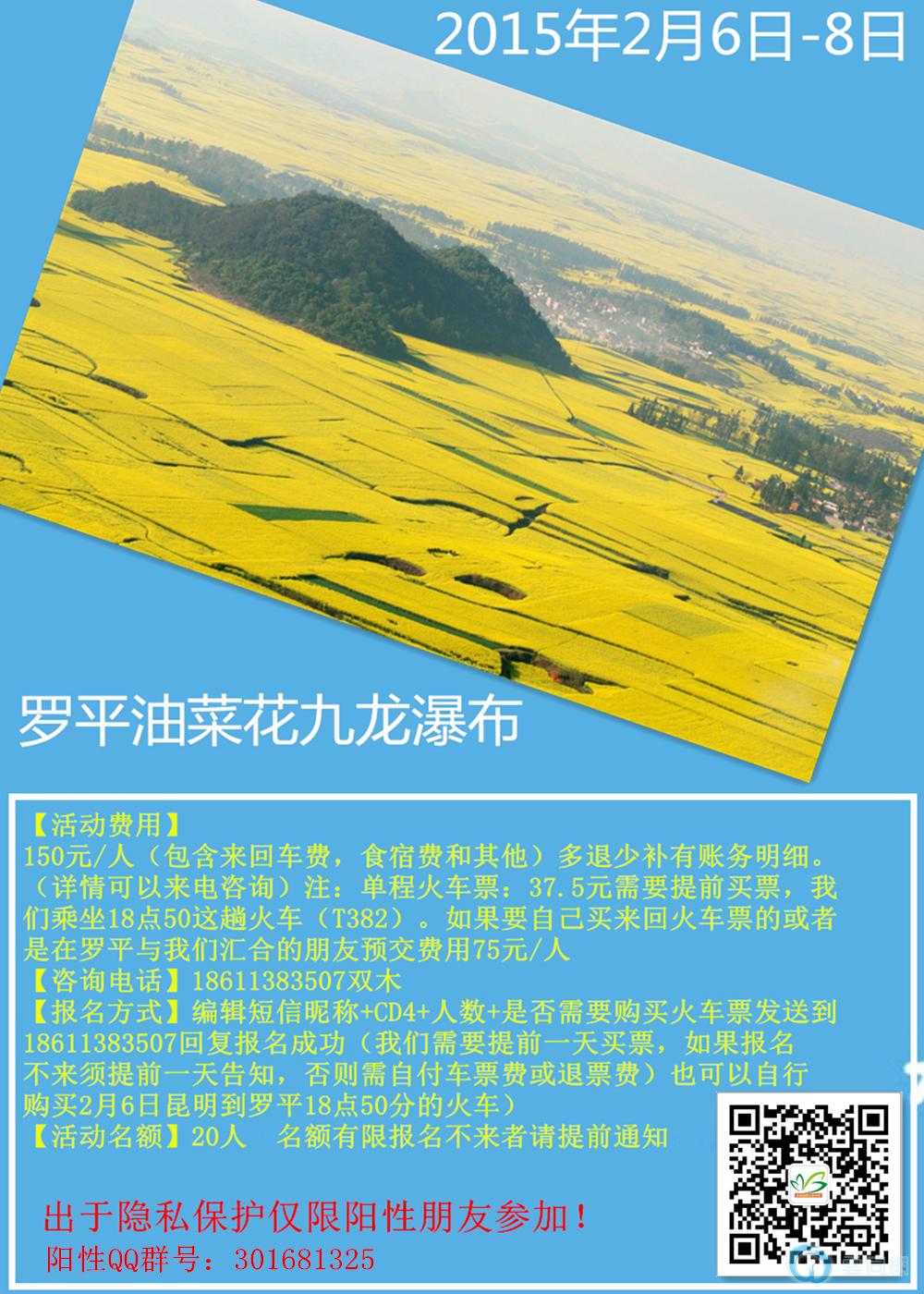 【报名方式】编辑短信昵称+CD4+人数+是否需要购买火车票发送到18611383507回复报名成功(我们需要提前一天买票,如果报名不来须提前一天告知,否则需自付车票费或退票费)也可以自行购买2月6日昆明到罗平18点50分的火车)