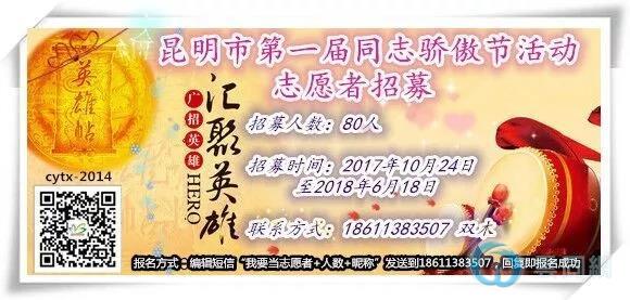 本次志愿者招募,范围面向昆明市以及云南省内外,不限于任何群体,只要愿意参与筹备同志骄傲节活动的即可。我们对您无任何实质性的要求,只有您有兴趣、有毅力、想去做这件事就行。