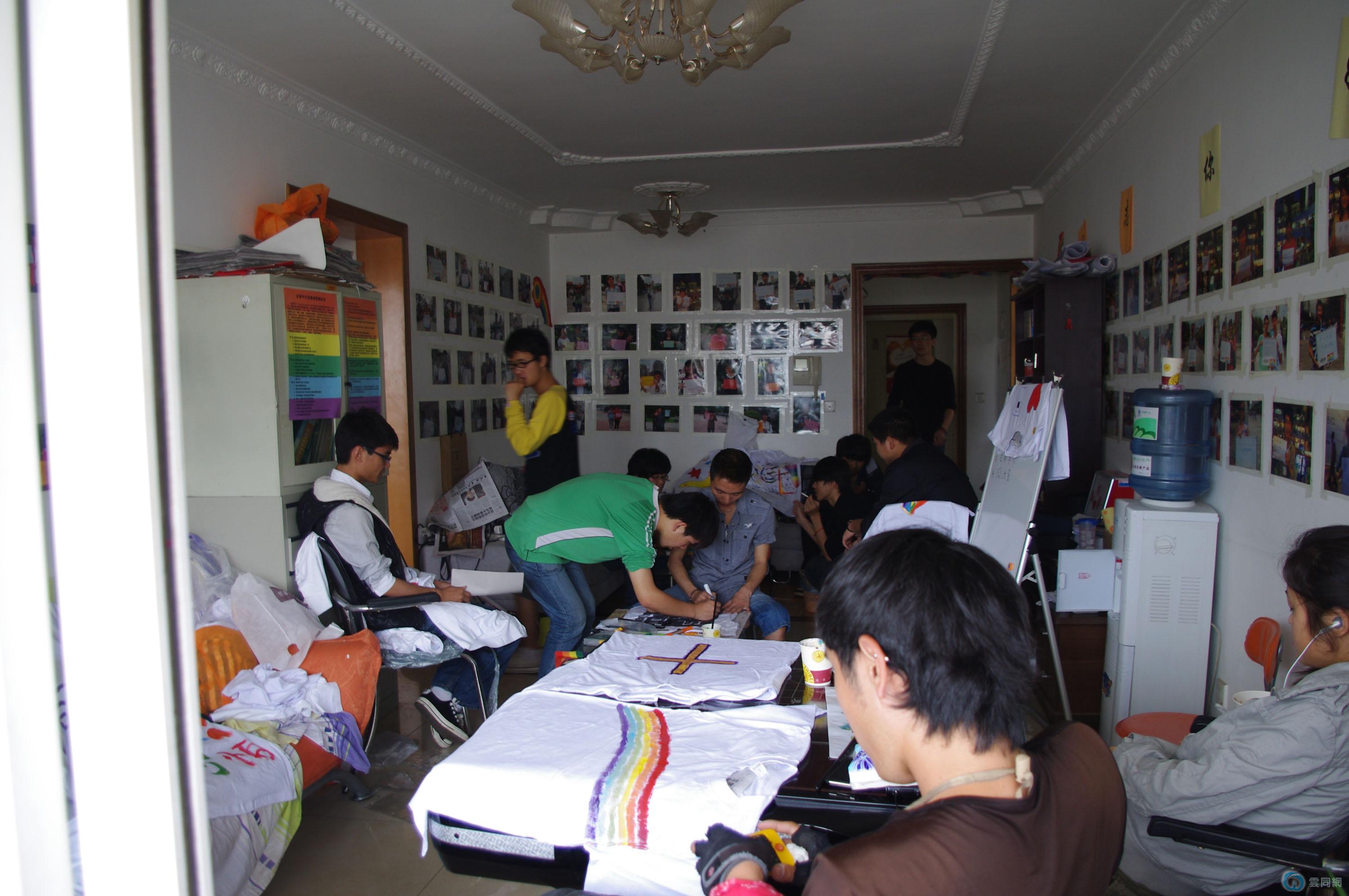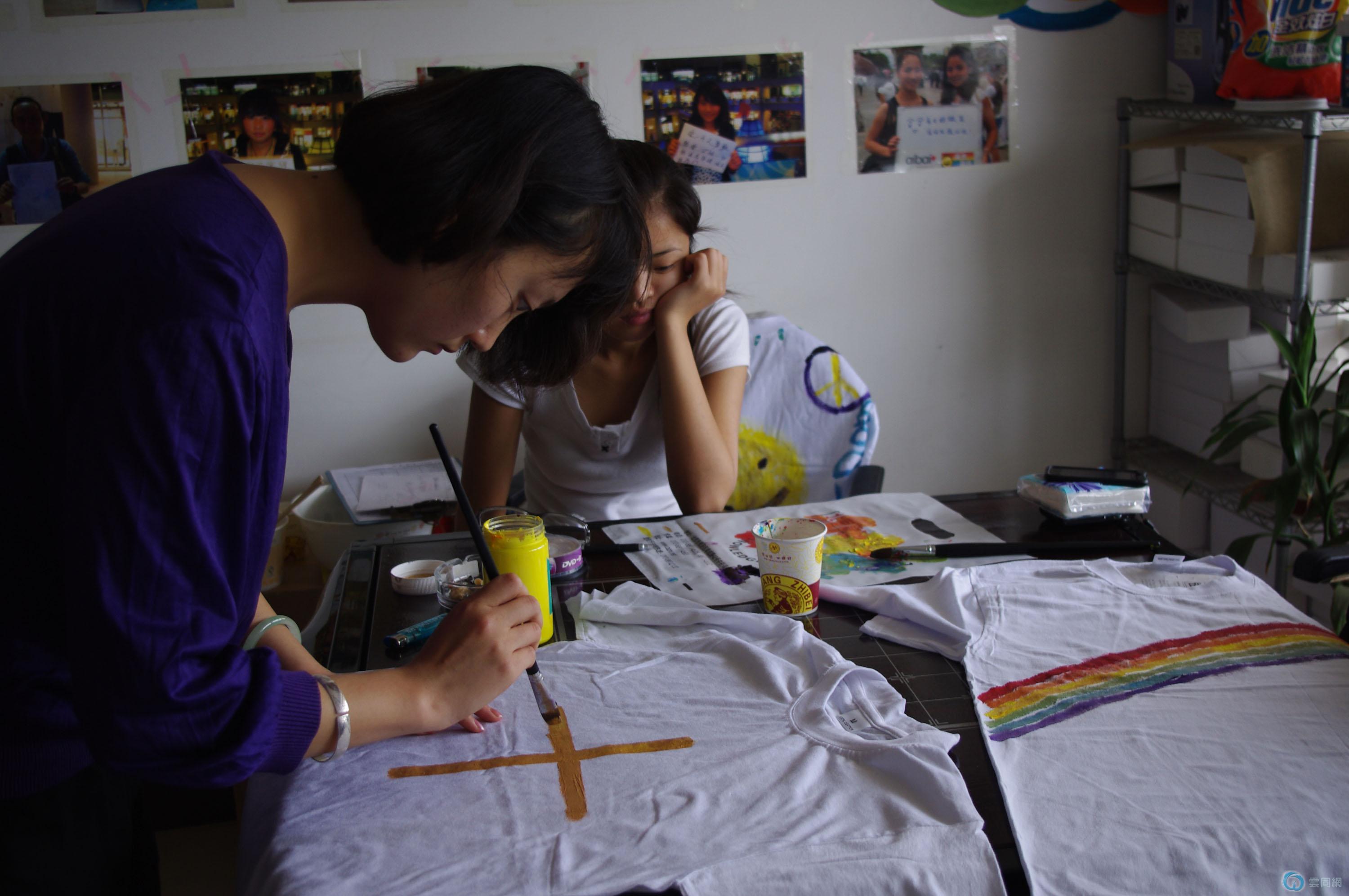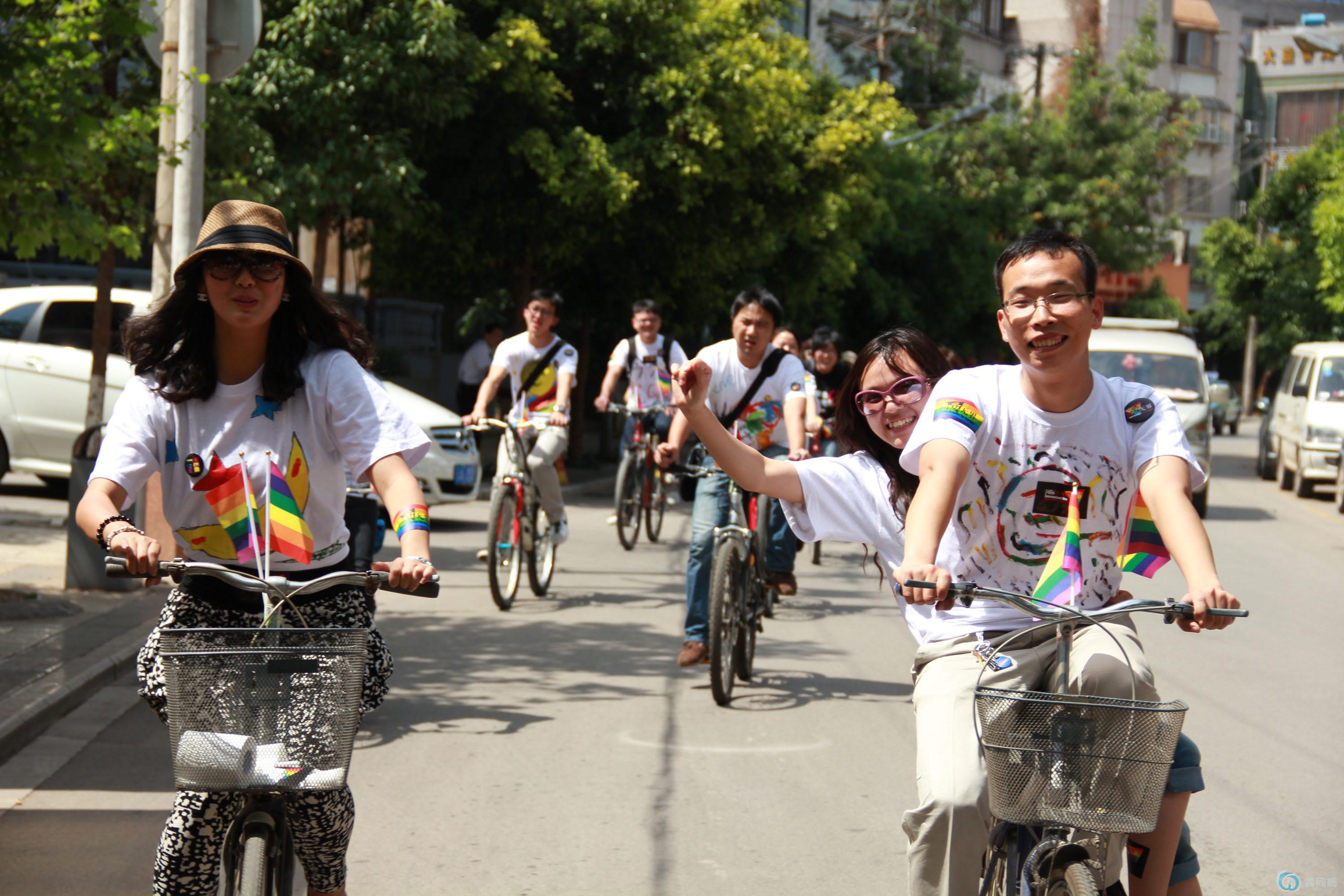 单车接力活动正式启动可以追溯到515日,昆明依然阴霾的周日。当日朋友们齐聚办公室,进行T恤的手绘活动。经过一个下午的奋斗,我们共制作了25件手绘T恤,其中蕴涵各种寓意:“恐同可耻”“幸福比性别更重要”“吾爱、吾愿”“other people have one father and one mother, but I have two fathers or two mothers.”“你是否嫉妒我的不一样”“I LOVE YOU ALL”“异性恋不可怕”“霓现彩云南”等诸多文字,幸福的笑脸、彩虹、红心甚至于荷花也成为朋友们手绘的最爱。大家希望通过这样的方式能够言自己之心声、引他者之反思、促社会之多元。