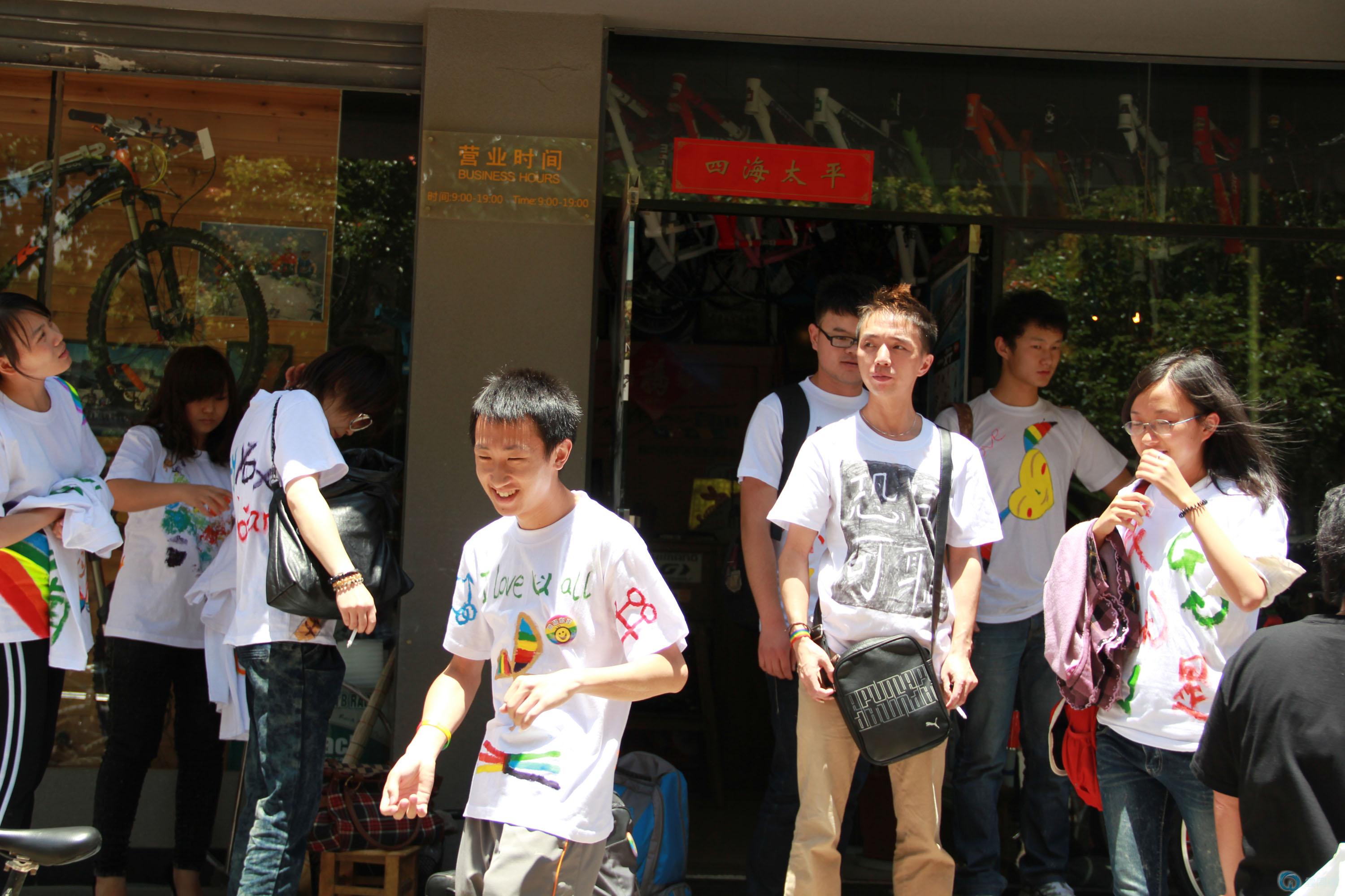517日本极为平常,但1990年的这一天,世界卫生组织(WHO)将同性恋从精神病名册上移除,使得这一天非常的富有深意且与众不同。为纪念这一天,云南平行从417日的例会就已经开始进行活动策划,经57日例会之计划完善、报名启动,直至515日手绘T恤的完成,最终我们在517日得下午正式开始该活动。为了体现活动之主题:I love you all,真正让社会了解同志、正视同志之存在,促进社会之和谐、包容、多元发展,我们以此为据,向社会诚征任何有志于提高同志社区社会影响的朋友、任何有志于推动中国社会向更开放、宽容、和谐方向发展的朋友、任何有志于推动保护弱势群体利益的朋友、任何有志于投身公益事业的朋友, 517日活动正式开始之时,共有26位朋友参与其中。其中既有同志、拉拉等圈内伙伴,也有直男、直女等圈外朋友。大家身份不同、兴趣各异,既有在校学生,又有社会人士,特别提及一位日本的朋友太郎。