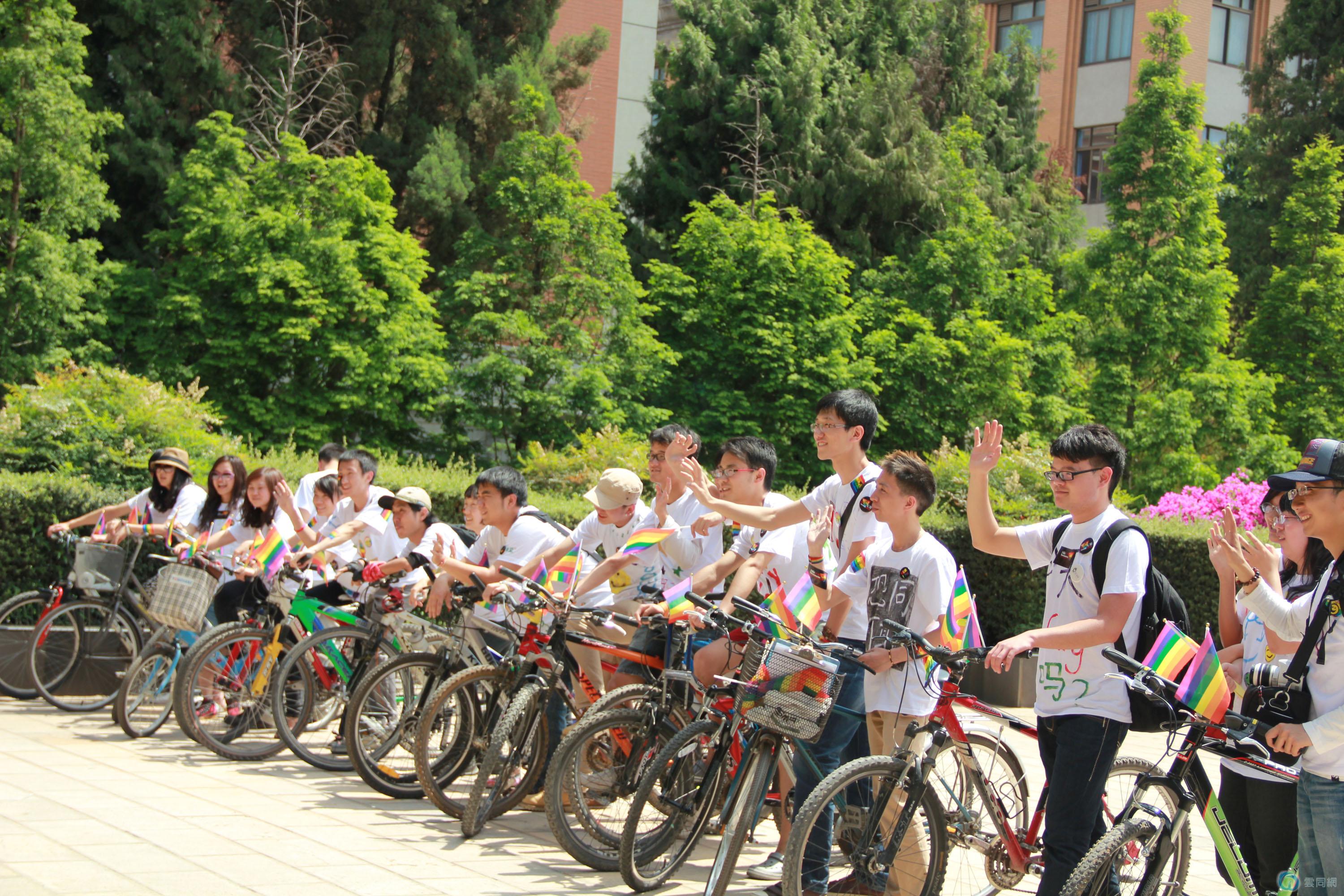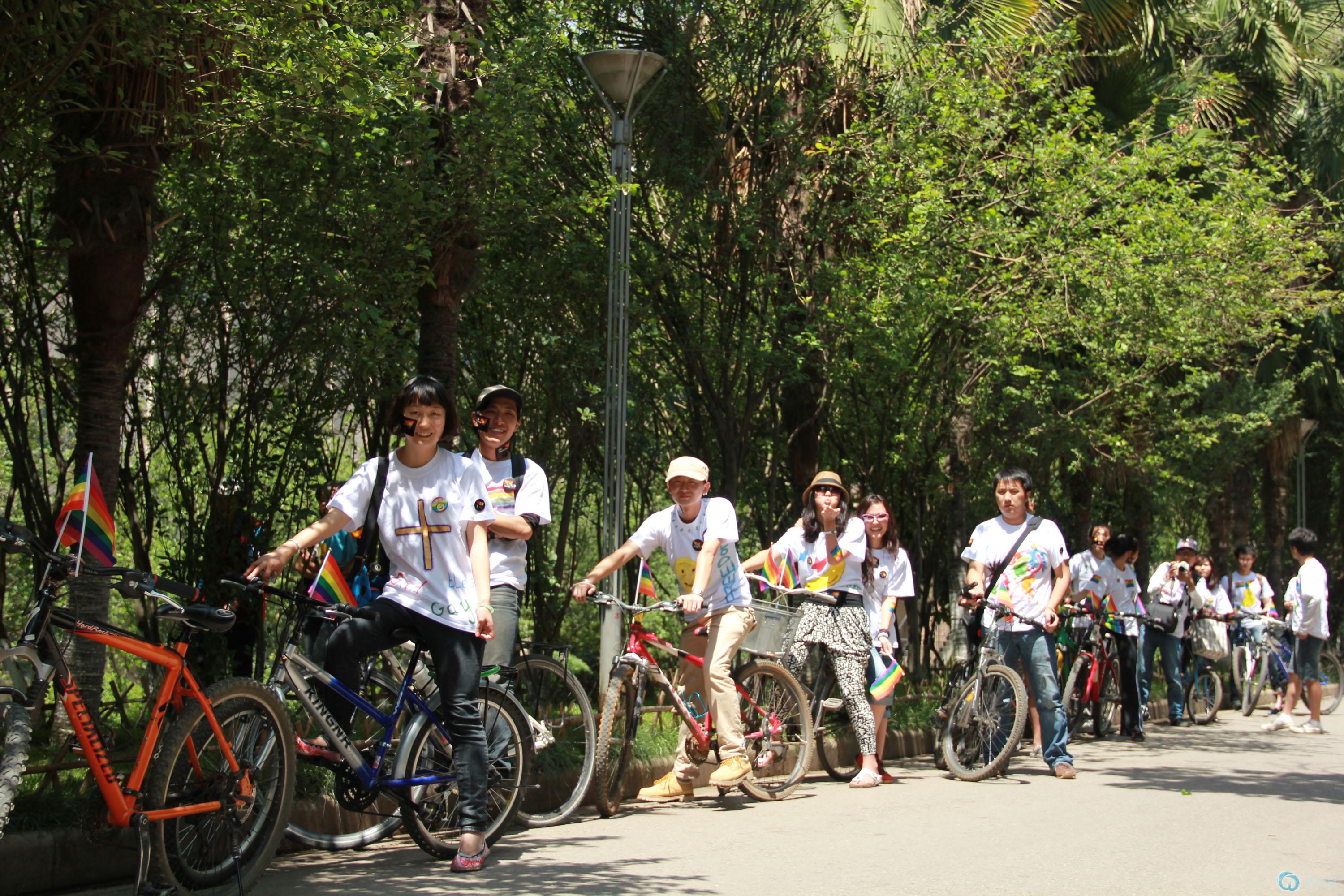 向路人介绍本次活动,进行交流。两位情侣坦诚自己20左右,对同志的态度很开放,认为大家都是80后,不存在歧视的说法,同性恋也是无所谓的事情。他们还与车队朋友大谈起同志电影。气氛非常地轻松。大家最后合影留念。↓