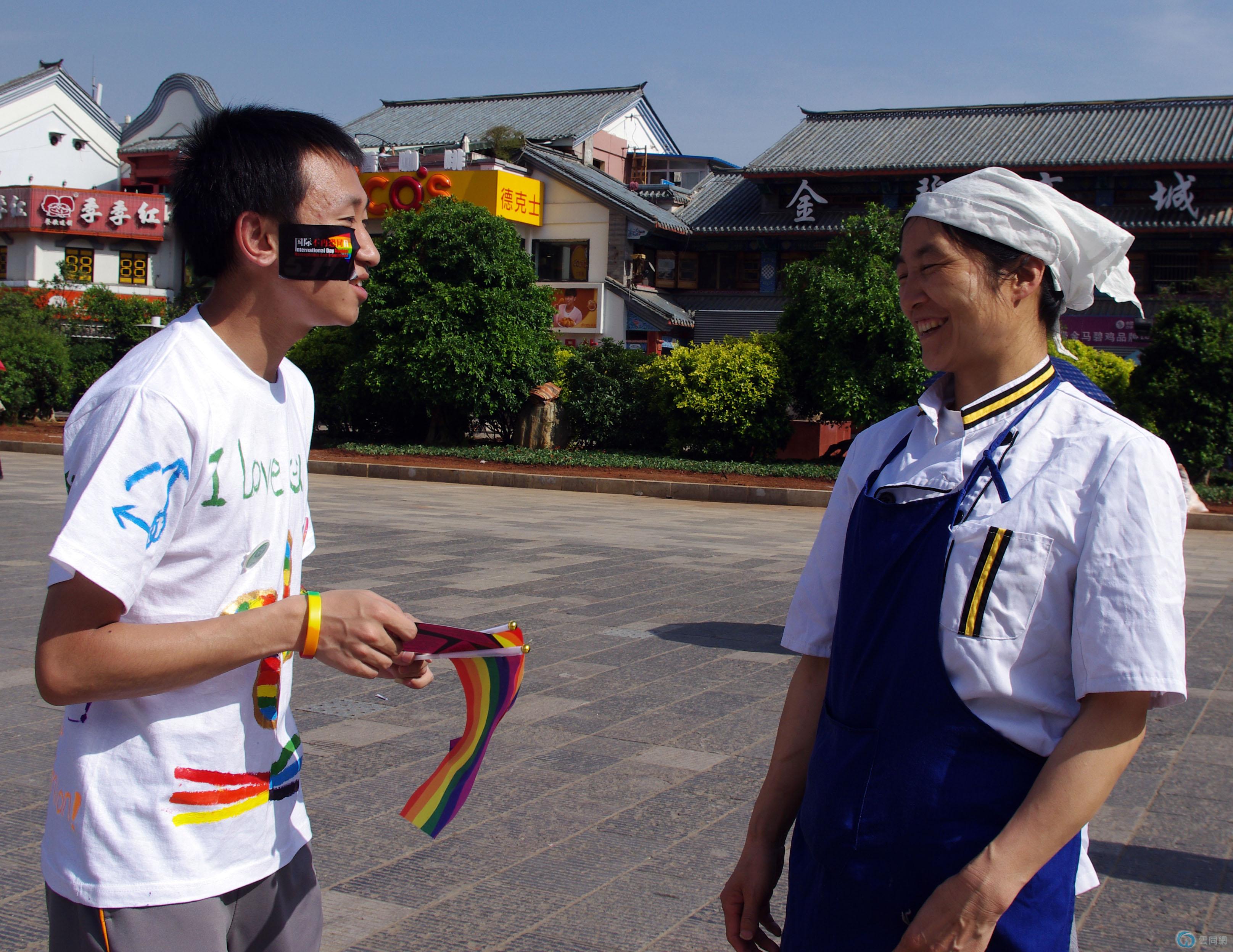 在与路人交流的过程中,我们碰到了两位60多岁的女士,我们向她们介绍这次活动的主题同时简单讲述同性恋之基本常识。两位女士拒绝了我们的拍照,但同意交流。其中一位女士说,“退回二十年,我们根本就不知道还有同性恋这回事,现在嘛,我们虽然知道了,但不认为中国有多少同性恋。”我们又问,那您如何看待同志呢?一位女士回答:“其实吧,只要不危害社会,不危害他人,同性恋也没什么嘛”。走之前,一位女士又说了一句,“怎么说呢,不支持不反对吧。毕竟我们都这个岁数了,让我们改变观念不大可能。”我们向她们表示感谢,并赠送明信片,为了她们的真诚。