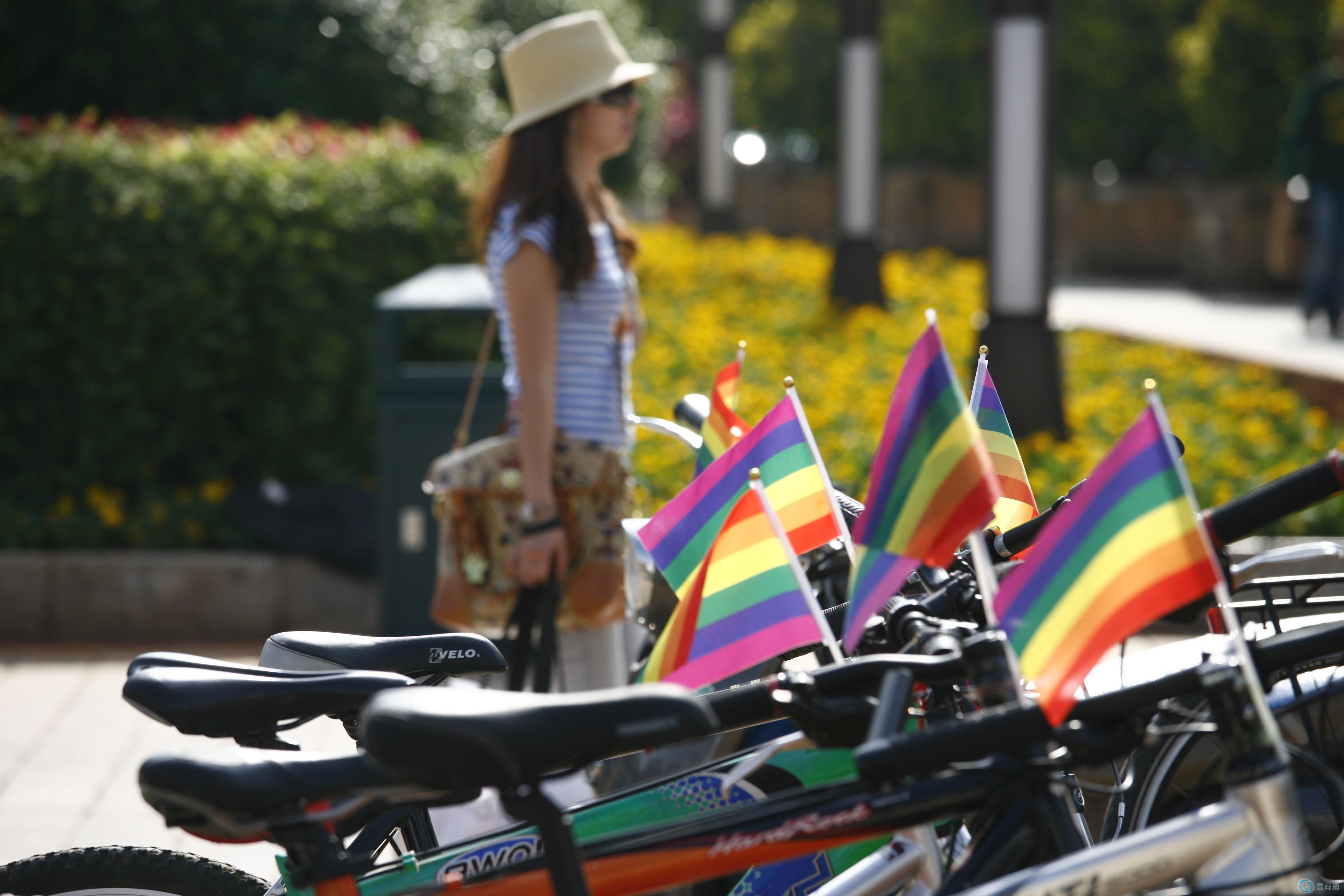 将彩虹旗分插到每个单车上的朋友们。↓