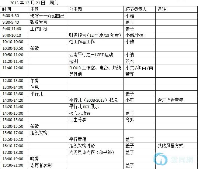 我们将于20131221日、22日(周六、周日)举办本机构2013年年会。非常希望能看到您的参加。云南平行是一个纯草根的NGO小组,我们目前服务LGBT群体与性工作者群体,主要针对公共卫生、社群文化、反歧视等方面进行工作。在2013年的工作中,我们成长了很多,也思考了很多。共志同者行这五个字实在是沉甸甸的。所以亲爱的平行儿们,大家一起,看看我们的足迹与未来!