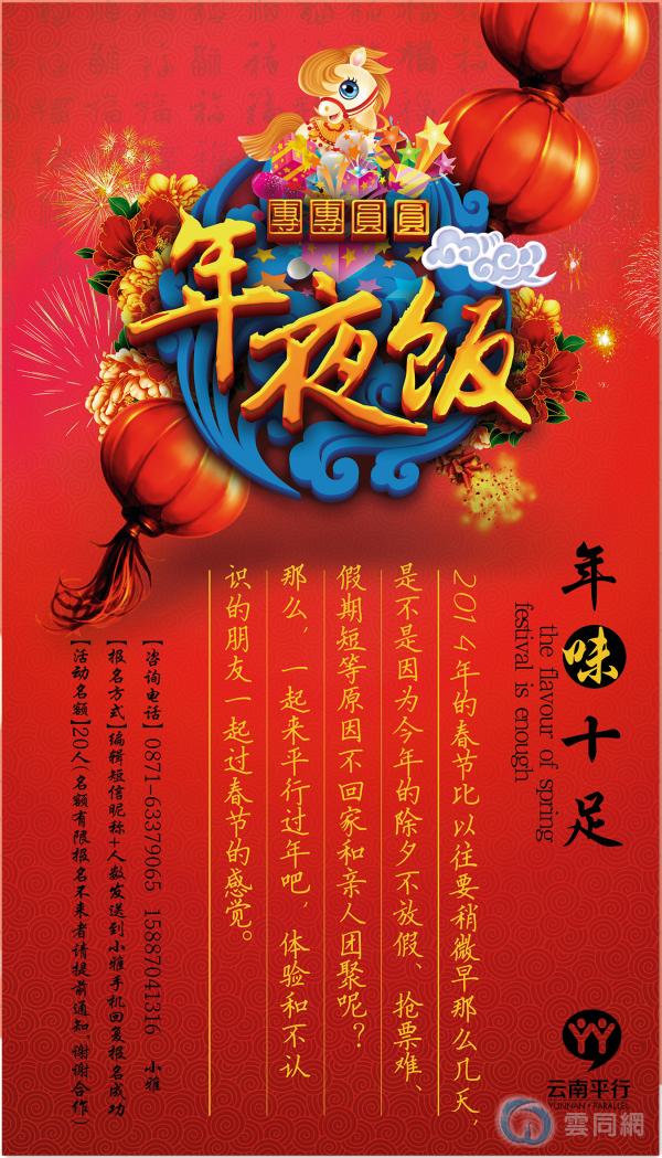 2014年的春节比以往要稍微早那么几天,是不是因为今年的除夕不放假、抢票难、假期短等原因不回家和亲人团聚呢?那么,一起来平行过年吧,体验和不认识的朋友一起过春节的感觉。