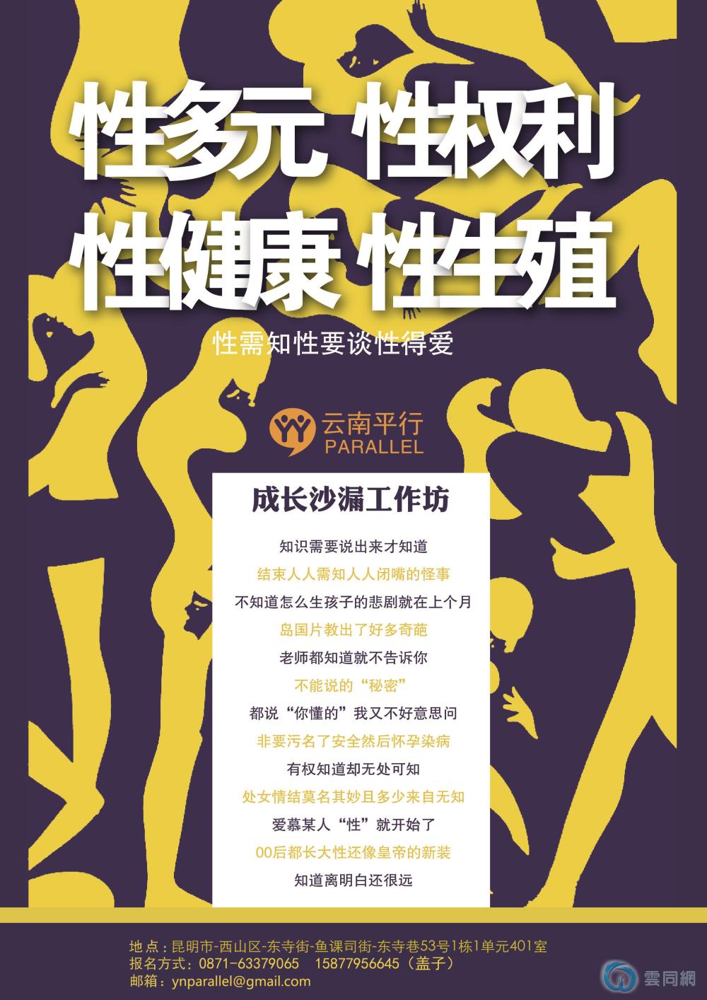 因此云南大学和云南平行合作举办此次《XXXX性教育》工作坊,小小补一课,大家来聊起,聊聊大家眼中的性,分享每个人的感受,学习真真的知识,告别所谓的脸红心跳谈性色变。