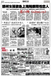 本报讯 郑州的一名女大学毕业生,与上海一女子从网上开始同性恋,两人相互往来于郑州与上海间。十天前,上海的女子突遇车祸身亡后,郑州这名女孩坚持要去陪葬,遭父母拒绝后,她多次要自杀。昨日上午,这名女孩被家人强行带到精神病院治疗。