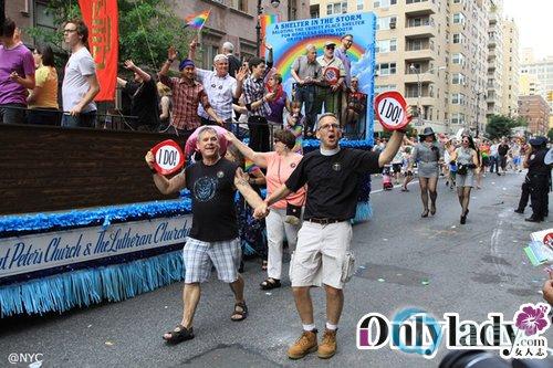 一对同性恋人手中拿着“I Do(我愿意)”的标牌