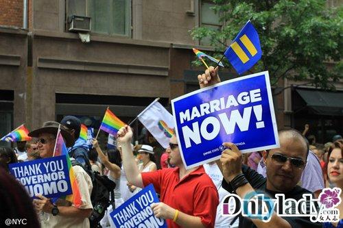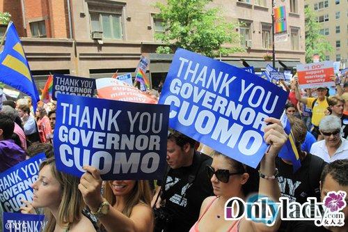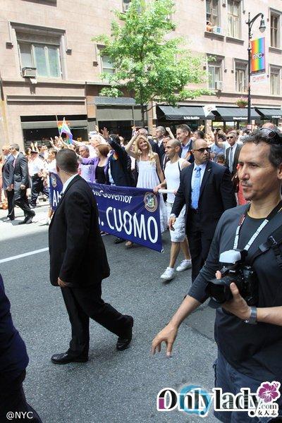 队伍正中挥手的男子是纽约州的州长,正是他恪守了诺言,努力促使了此次同性婚姻法案的通过。当他出现的时候,整条街都沸腾了,许多人都在向他表示最忠心的感谢。