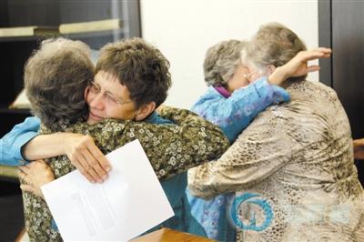 5月10日,美国纽约,同性恋者拥抱庆祝奥巴马明确支持同性婚姻。