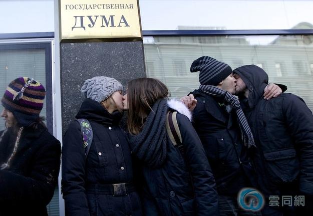 俄同性恋议会大楼外公开接吻 抗议反同性恋法