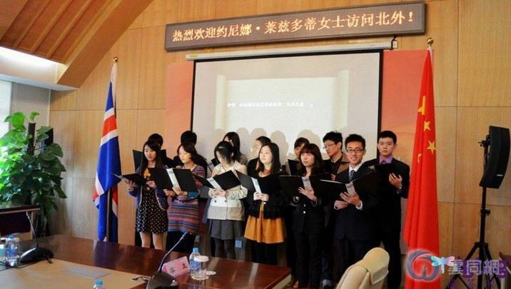 校方称呼莱兹多蒂为“冰岛总理夫人”。莱兹多蒂相当健谈,说自己曾是单身母亲,其儿子曾在中国居住了六年。图为校方特别安排学生们用冰岛语朗诵冰岛诺贝尔奖诗作:五月之星。