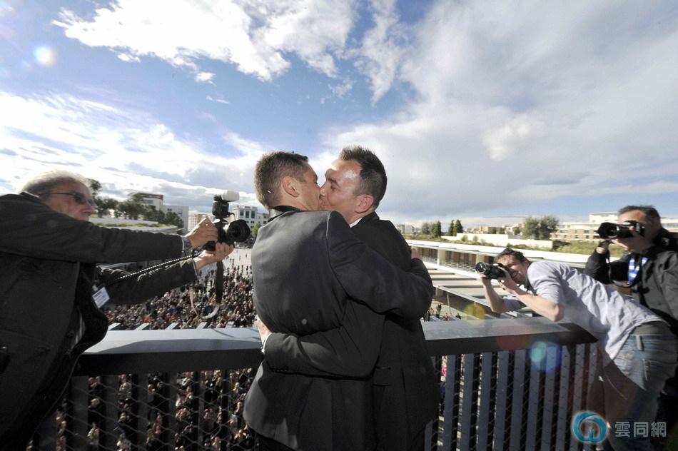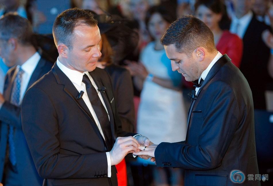 近日,法国两名男同性恋者奥宾与布华罗在法国东南部蒙彼利埃市举行婚礼,成为同性婚姻法生效后首对合法结婚的同性伴侣,数百宾客与记者见证了这场感人仪式。让我们来看看两人婚礼激动人心和温馨的一刻。