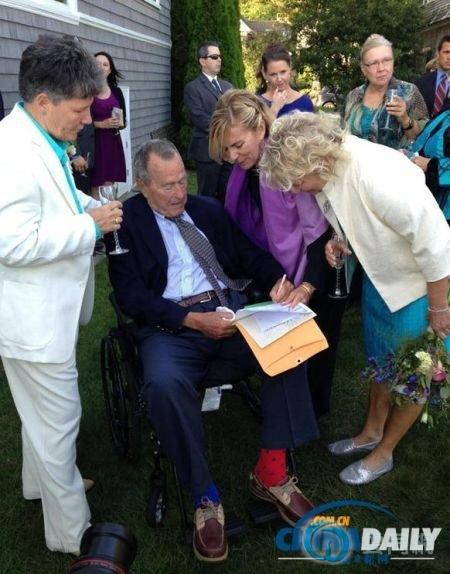 据《今日美国》9月26日报道,美国前总统老布什夫妇近日在美国缅因州出席了一场同性恋婚礼,并为新人签署结婚证。