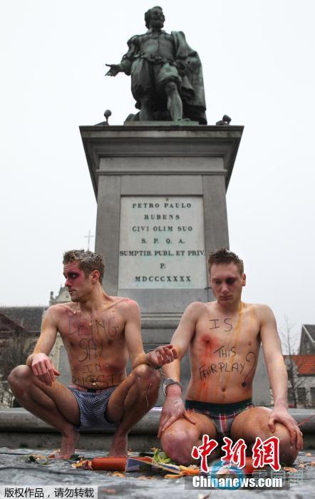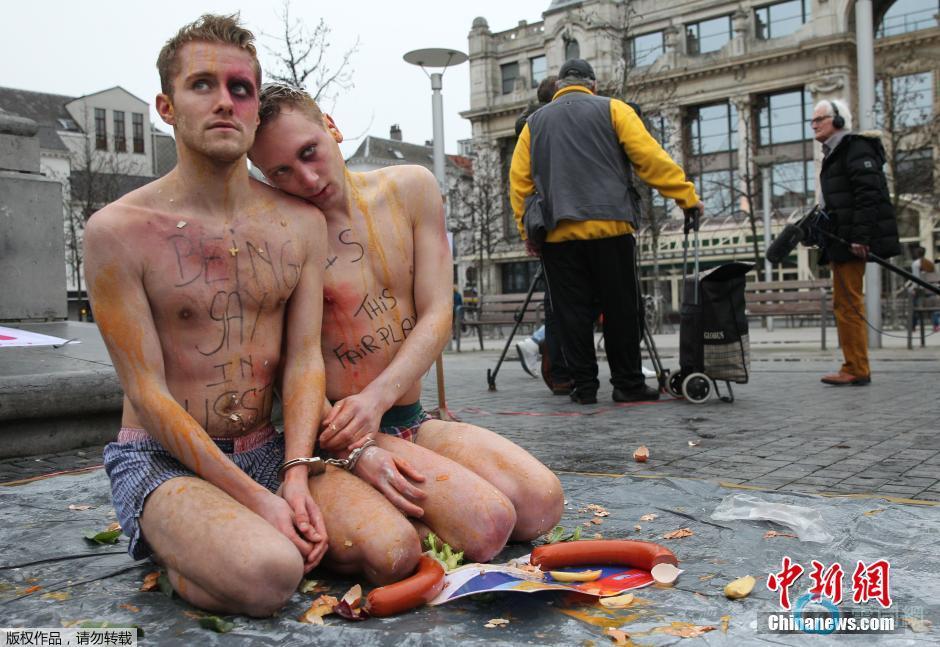 当地时间2014年2月6日,比利时安特卫普,同性恋青年组织“年轻但是不直”的成员在广场上进行角色扮演,诠释俄罗斯同性恋、双性恋及变性人遭受的暴力。