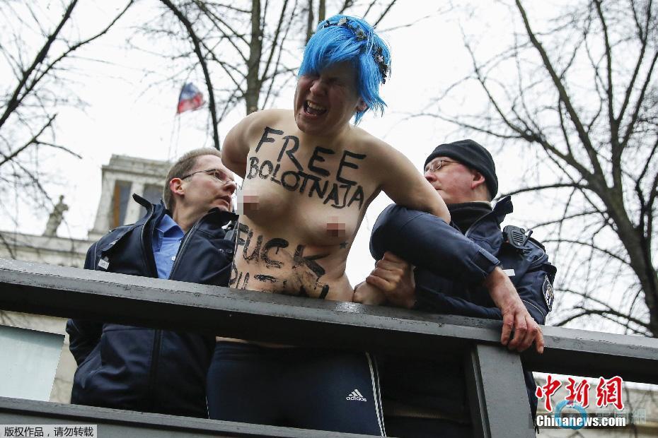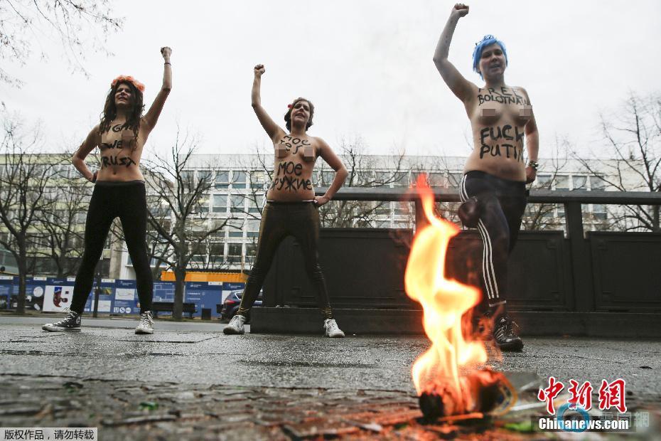 当地时间2014年2月7日,德国柏林,裸露上身的女权组织成员在俄罗斯驻德大使馆外示威。当天是索契冬奥会开幕日,该组织试图通过此举对俄总统普京的同性恋政策表示抗议。