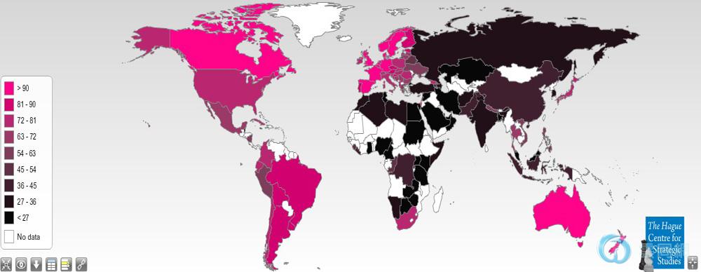 总部位于荷兰的海牙战略研究中心(HCSS)2月20日发布了一份各国军队对同性恋、双性恋、变性人(以下简称LGBT)的包容度报告,并依据包容度从高到低打分,即LGBT军队指数(LGBT Military Index )。根据这份报告,在该中心调查的103个国家和地区中,新西兰军方对LGBT的包容度最高,获得100分满分。荷兰和英国并列第二。中国大陆排名第62位,分数为41,5分。
