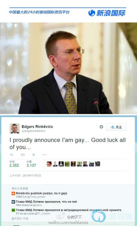 “我自豪地宣布我是同性恋,祝你们好运。”拉脱维亚外长林克维奇斯6日发推宣布“出柜”,推文已被转发超2300次。41岁的林克维奇斯也成为该国首名公开同性恋身份的高官。拉脱维亚尚未允许同性婚姻,社会保守观点流行,高官“出柜”可能引发争议。