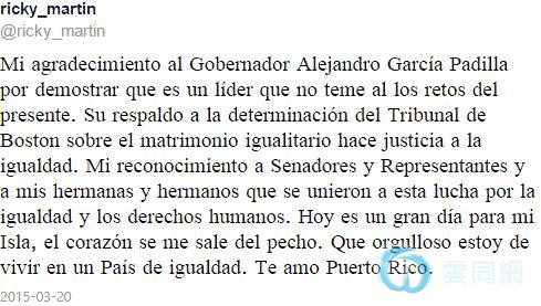 出生于波多黎各的著名歌手瑞奇·马丁(Ricky Martin)在Twitter上用西班牙语写道:“今天对我的小岛来说是个伟大的日子。我的心几乎跃出胸口。生活在平等的邦令我如此骄傲。我爱你,波多黎各。”