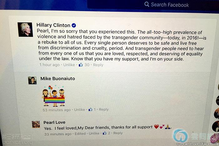 5月6日,希拉里在爱珍珠的Facebook上写道:““珍珠,很遗憾你经历了这种遭遇。已经2016年了,跨性别者仍然面临严重的暴力和仇恨,这是对我们所有人的警示。每个人都应该安全自由地生活,不受歧视和虐待。我们每一个人都应该发出声音,让跨性别人士知道自己被爱、被尊重,而且在法律面前享有平等。我支持你,我站在你这边。”