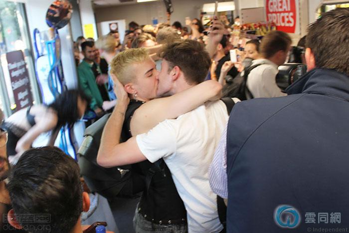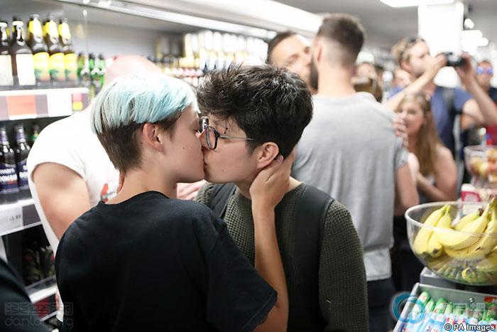 英国当地时间13日傍晚,数百人在伦敦东部的桑斯博里超市(Sainsbury's)参与集体接吻行动,抗议一对同性恋人在这家超市遭到歧视