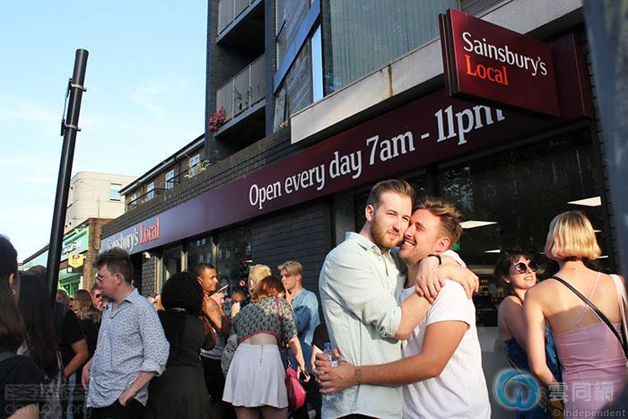 8月13日,一对男子在桑斯博里超市接吻