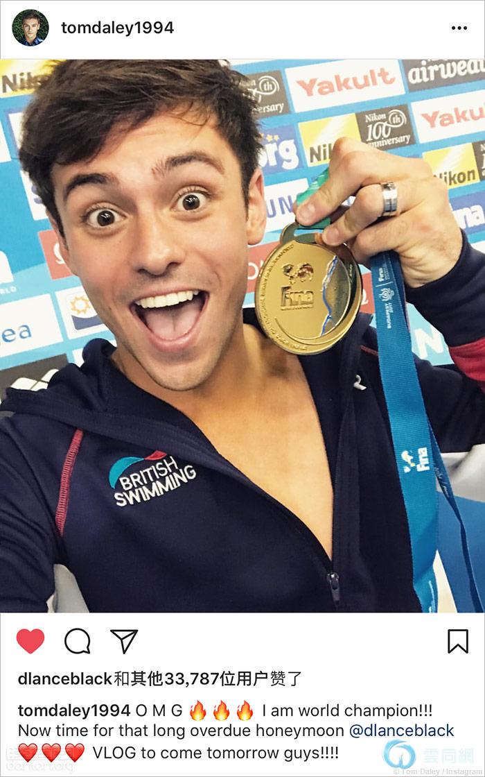 戴利于北京时间今天凌晨1点多在Twitter和Instagram上分享了自己手持金牌的照片,留言说:“天啊!我是世界冠军啦!终于可以和达斯汀·兰斯·布莱克一起度蜜月了!这个蜜月延期太久了。”
